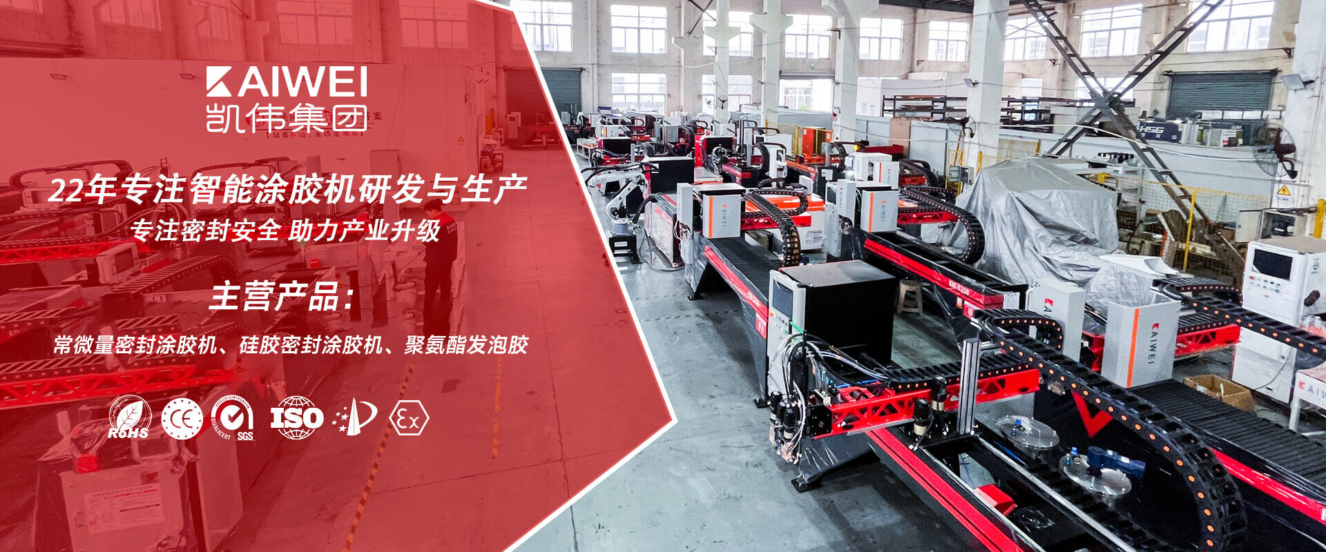 上海凱偉智能科技(集團)有限公司創建于2004年,總部位于上海,是一家研發和生產工業密封系統、機器人發泡設備的技術企業。公司擁有專業的研發機構,完善的技術創新機制,為國內外知名企業提供密封點膠解決方案。 凱偉堅持“以技術為先導,以人才為根本,以質量為生命,以信譽為基礎”的企業宗旨,擁有30多人技術研發人員,整體研發水平居國內同行業前列。取得機器人定量發泡機等技術獲得國家專利多項。主要產品包括全自動涂膠設備、聚氨酯AB雙組份點膠設備、PU密封涂膠機、鈑金機柜密封涂膠機、6軸機器人點膠設備等。如KW-510,KW-520,KW-523等常微量全自動雙組份涂膠機等機型,廣泛適用于新能源汽車、機柜、空氣過濾器、空調凈化設備、凈化門、空調檢修門、防爆燈具等領域。 凱凱偉涂膠機先后通過SGS、ROHS、CCC、CE、防護等級認證、ISO9001-2000國際質量體系等多個認證。公司擁有專業的研發隊伍,能為客戶提供技術可靠的產品及完整方案。同時具備完善的售后服務體系,可為客戶提供產品安裝、培訓小程序【凱易學】等良好的售后服務,其售后水平,獲得了客戶的一致認可和高度評價。全自動點膠機產品在暢銷國內的同時,遠銷德國、美國、意大利、越南、智利、俄羅斯、印度及中東、東南亞、南美等130多個國家和地區。